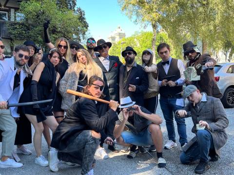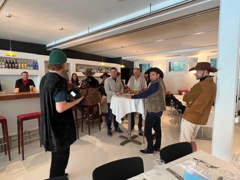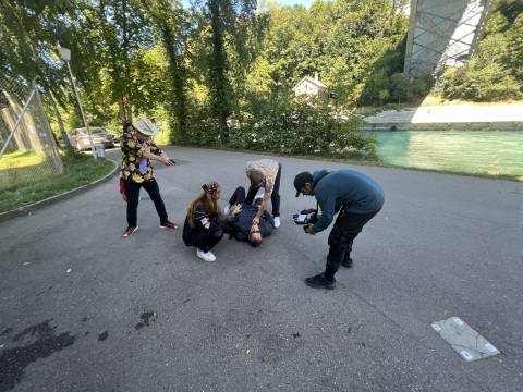 In Gruppen aufgeteilt wurde uns jeweils eine vordefinierte Story vorgelegt, zu welcher wir einen Kurzfilm drehen werden. Nachdem wir die Stories noch etwas ausgeschmückt, Kostüme, Rollenaufteilung und Drehorte definiert hatten, gings an die Produktion. Die Mitarbeitenden haben sich köstlich amüsiert. Manchen war die Rolle so richtig gelegen, manche mussten sich zuerst noch etwas daran gewöhnen vor der Kamera zu stehen.
